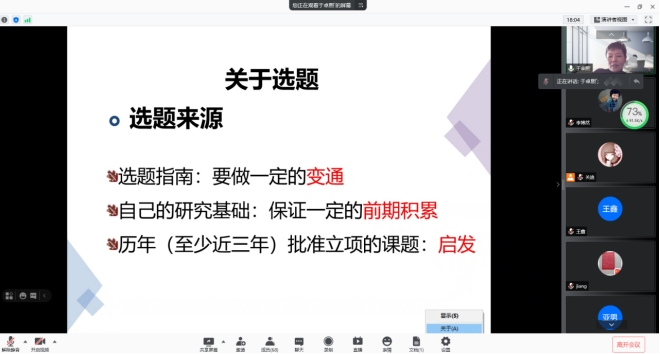 报告会中,于教授首先讲解了项目申报各个类别的区别。然后进一步剖析了关于选题的问题,于教授表示选题来源一定要做到变通,保证一定的前期基础,且要对历年批准立项的课题做一定研究。最后,于教授用自己申报的课题给大家详细的介绍了关于选题、关于论证、关于细节等方面的做法。使大家对于国家社科基金申报有了更加深入的了解。