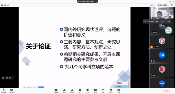 2021年10月12日下午2点,我院特邀中国现场统计研究会大数据统计分会理事于卓熙教授做线上学术报告,报告由学院统计系系主任杨凯老师主持,学院副院长刘铭老师、学院副院长李纯净老师、学院部分老师及全体研究生参加了本次线上学术报告会。
