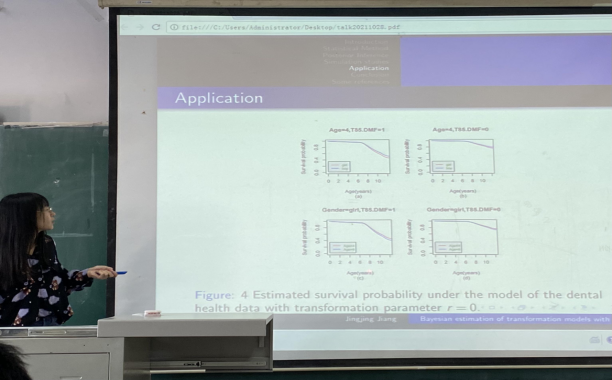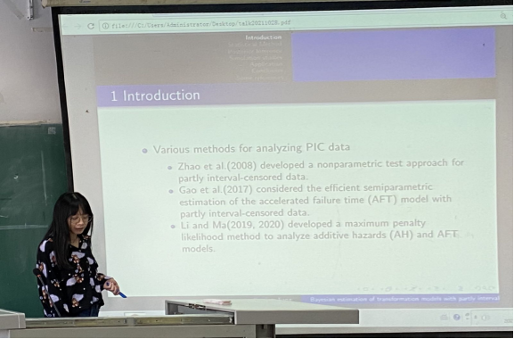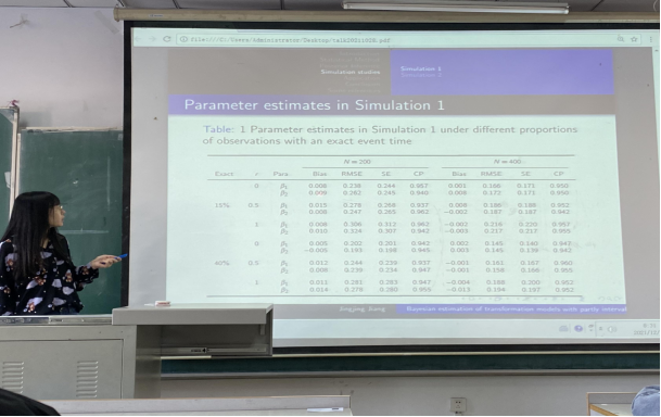 会议过程中蒋京京同学简要阐述了其论文的背景知识和哈密顿蒙特卡洛算法改进算法的图表结果。在许多科学领域中,经常出现部分区间截尾数据,包括精确观测数据和区间删失观测数据。然而部分区间截尾数据分析方法的发展相对有限,故提出了一种完全贝叶斯方法和有效的马尔可夫链蒙特卡罗方法,该方法易于实现,操作可行。最后蒋京京给出了该算法的实际应用讲解,验证了该算法的有效性,最终得到了如下结论: