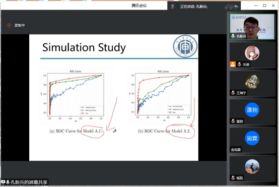 孔新兵教授为我们全面系统的分享了Methodology-Model。主要讲解模拟研究、实际案例部分,引发了同学们浓厚的学习兴趣与讨论热情。一方面激发了同学们关于数学模型理论建立的研究热情,另一方面让同学们对张量序列的波动变化点检测在实际生活、在当今中国的用途更加明确。报告结束后,孔教授对同学们提出的诸多问题一一做了回答。在场师生均表示聆听本次报告受益匪浅,收获颇多。