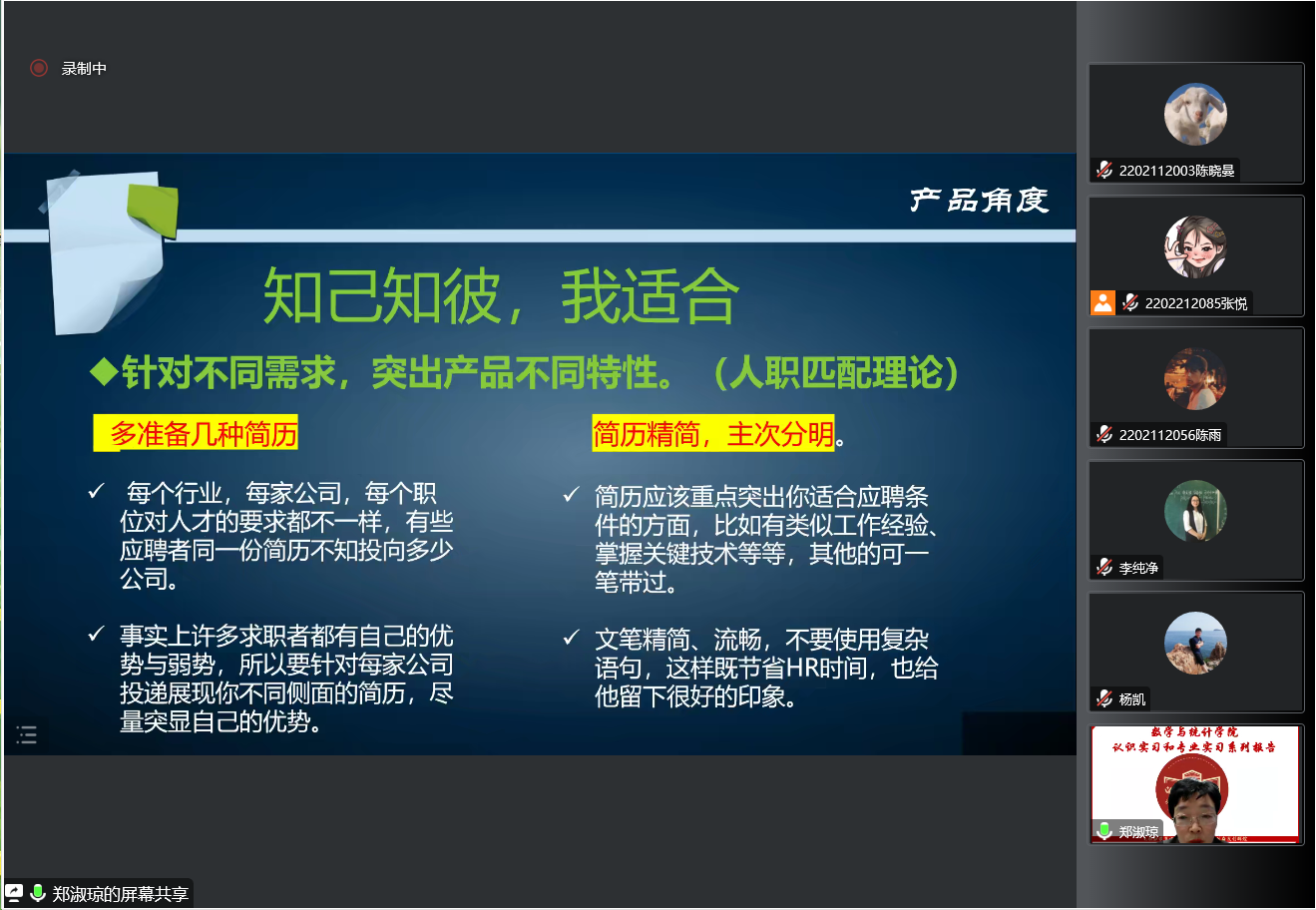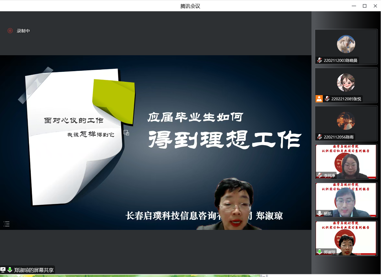 (通讯员:杨凯)2022年12月1日下午16:00,我院邀请长春启璞科技有限公司郑淑琼董事长做题为《应届毕业生应该如何找到理想的工作》的报告。本次报告由学院统计系主任杨凯主持,学院副院长李纯净、统计系支部书记袁晓惠,以及统计系胡茜等青年教师以及2020级、2019级本科生以及研究生参加了本次线上报告。