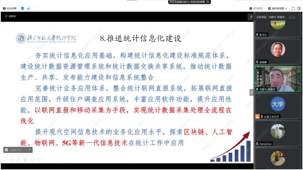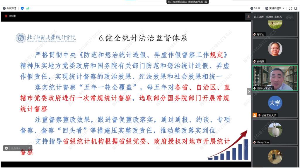 此外,在接下来的讲解中,宋旭光教授为学院师生介绍了统计现代化改革的各个方面,主要包括统计指标体系,统计调查制度体系,国民经济核算体系,统计监测体系,统计监督体系,统计信息化建设,统计工作保障机制等方面。在统计体系建设方面,统计部门与其他政府部门之间要紧密联系,相互交流,防止数据孤岛问题,同时要更新数据收集体系,实现统计数据报采集处理的全面在线化;在行政监督方面,要严格贯彻中央《防范和惩治统计造假、弄虚作假督查工作规定》,执行好统计督察工作,保证数据质量。