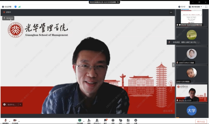 (通讯员:关迪)2023年12月20日14:00 ,北京大学光华管理学院涂云东教授为我院做线上学术报告,会议由学院副院长杨凯副教授主持,学院部分老师、研究生参加了本次线上学术报告会。