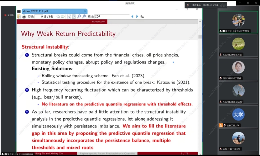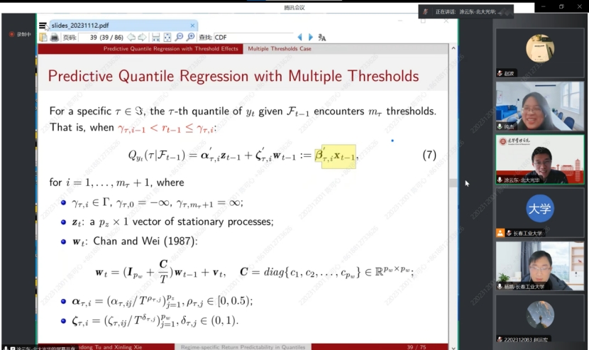 在接下来的讲解中,涂云东教授为我们介绍了分位数回归预测的性质,每个预测子的可预测性可以根据阈值变量的值从一种状态切换到另一种状态,并且可以在分位数之间变化,并且预测器可以具有不同程度的持久性。提出了一种与自适应群Lasso相结合的序列估计方法,以有效且一致地估计未知的多个阈值。为了消除序列估计中模型错误指定对阈值后续推断的影响,进一步考虑了阈值的分区估计。所得到的阈值估计量不渐近地依赖于来自其他状态的参数,并且具有对称的极限分布。最后采用自适应Lasso来识别每个方案中的重要预测因子,以提高每个分位数的预测精度。蒙特卡罗模拟证明了该方法在有限样本中的良好性能。对美国股票收益率的实证分析表明,收益率的可预测性随着经济政策不确定性的不同而变化。