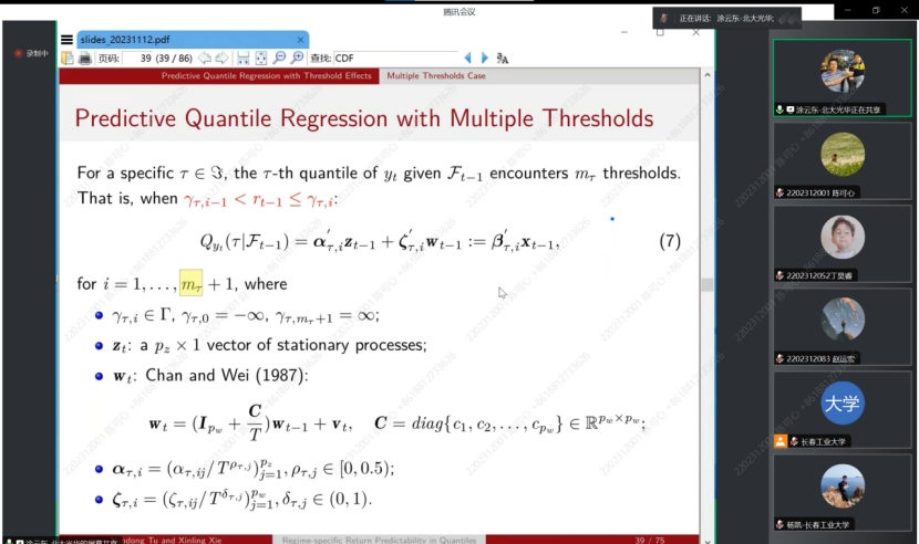 涂云东教授在本次研究中,提出了一种具有多阈值的分位数回归预测算法,以捕捉股票收益预测中潜在的区制转换机制。涂教授从平均回归预测开始讲起,详细了讲述了平均回归预测的理论和公式,然后引入分位数回归预测基础理论,并且详细解释了为什么收益的可预测性较弱等问题。