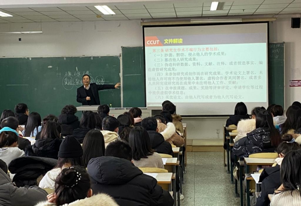 于2021年12月15日12:45在科研楼507举办学术道德与学风建设宣讲教育系列活动之预防学术不端行为专题报告会,会议由学院副处级组织员兼研究生辅导员应艳主持,校教学指导委员会常务主任兼院学术委员会主任刘庆怀主讲,全体研究生参加此次会议。