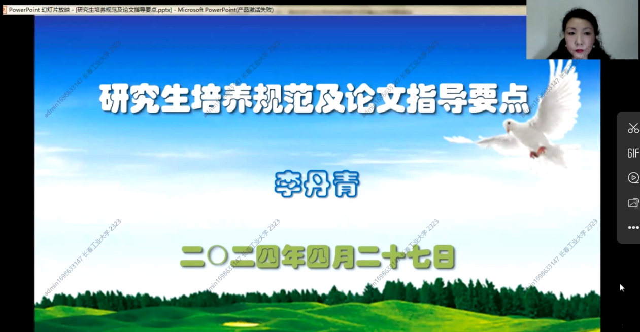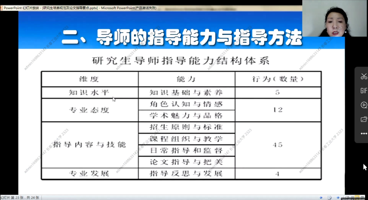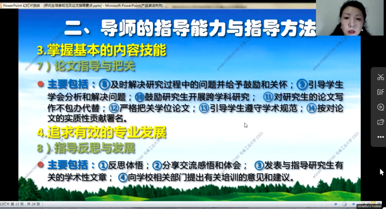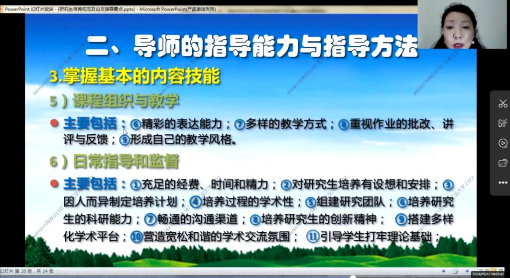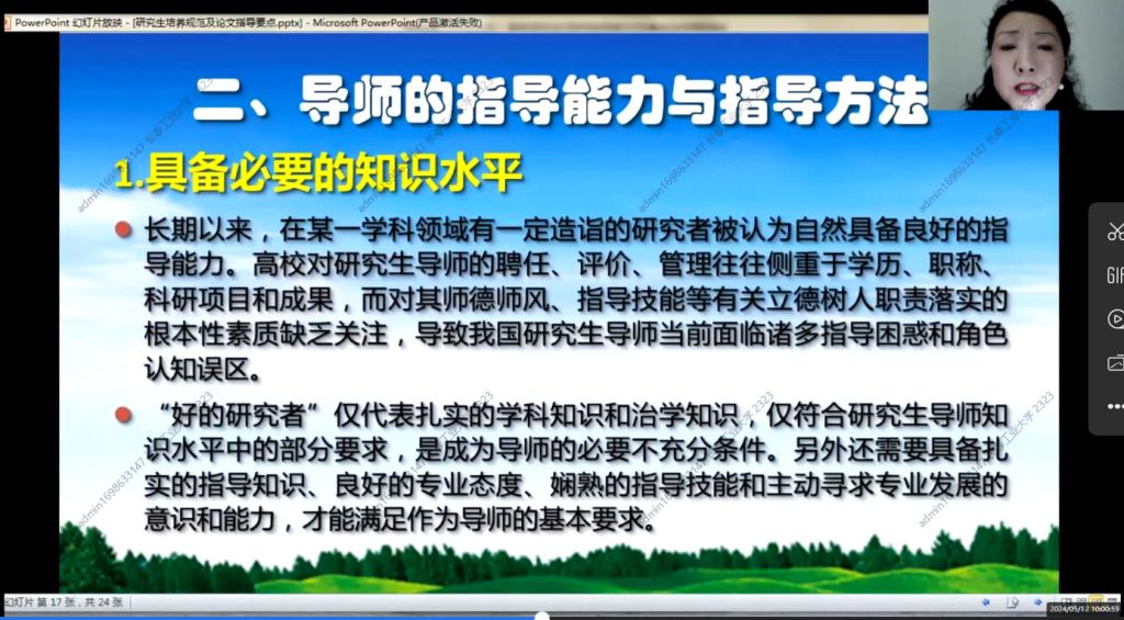 2024年5月12日上午8点30分,第一期培训班在线上如期举行,学院副院长杨凯副教授主持会议,学院全体研究生指导教师参加了本次培训。本次培训由浙江大学李丹青老师讲述研究生培养规范及论文指导要点。