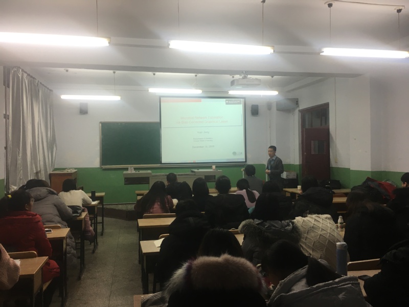 报告会中,朱文圣教授从以一些医学实例引出报告的主题,其中数据基于随机化而来的,研究的是对于不同的人给出不同治疗方案,运用动态治疗方案(一系列决策规则),主要针对的目标给出最优的治疗方案,并对条件期望进行建立线性模型,其关心的是治疗的差别,给出一些定理以及定理证明。之后,在理论的基础上,朱文圣给出了数据的模拟,用以说明理论的应用。最后,朱文圣老师对同学们提出的问题进行了详细的解答,也与学院里的老师进行了深入的互动。