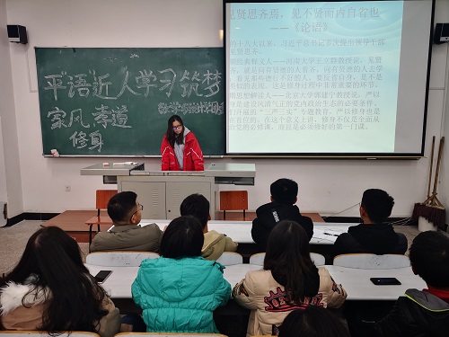 团委于2018年11月14日在林园校区教图楼213教室开展“学习筑梦”系列活动之《平“语”近人》之“家风,孝道,修身”。学院2018级全体学团干部参加本次会议,此次会议由170802班团支书宋思晗主持。